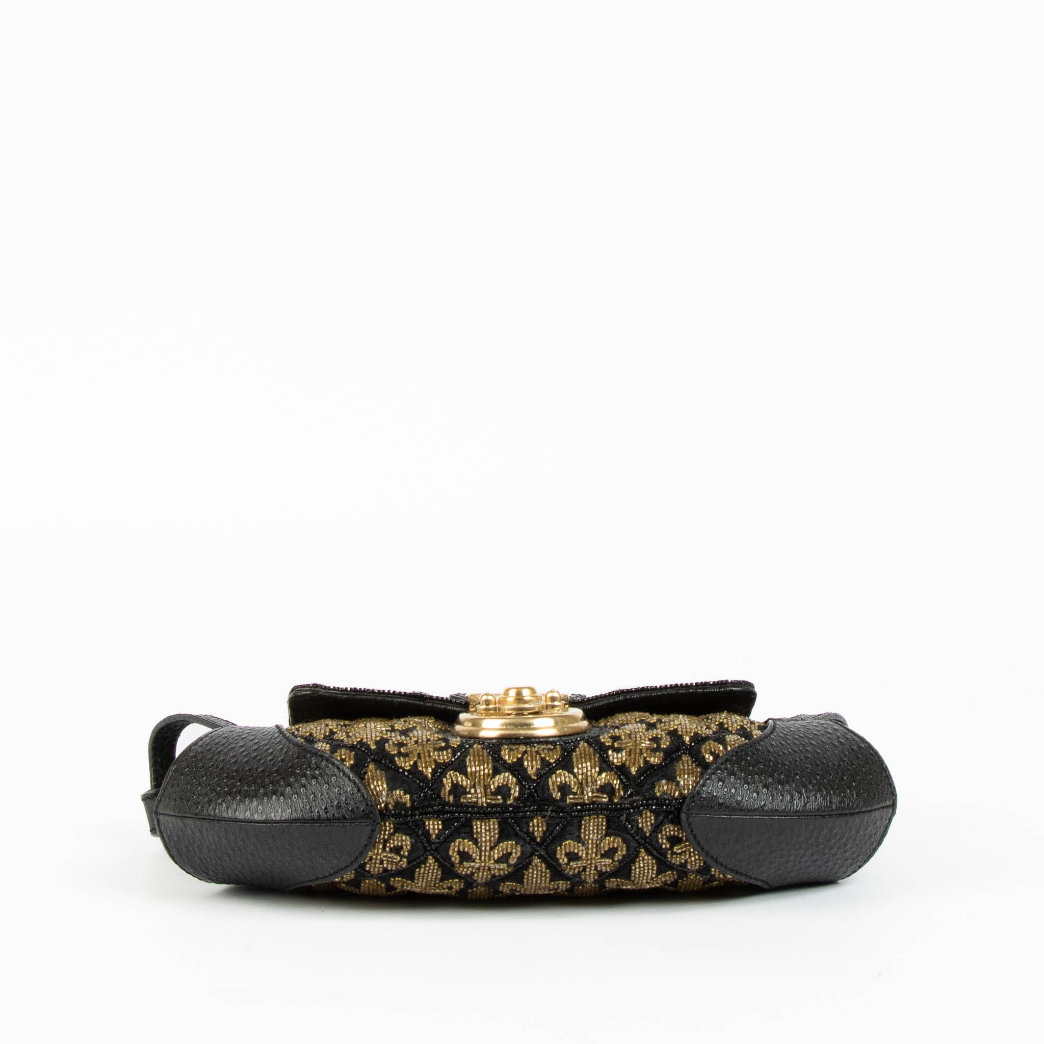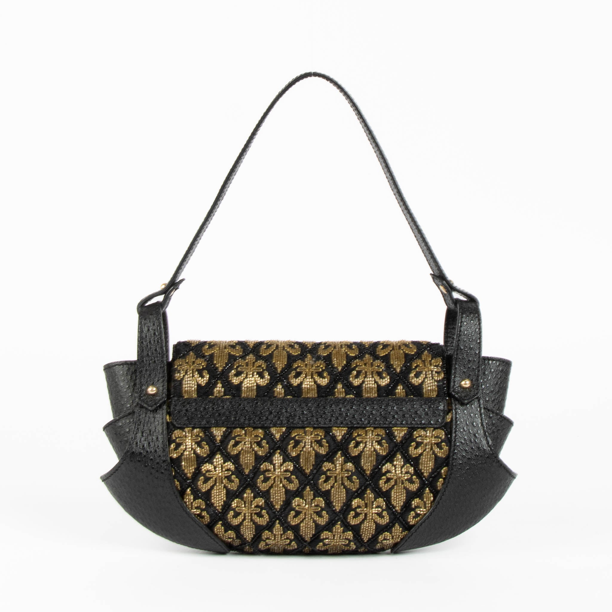 Crafted in a black base with gold-tone accents, this bag features intricate Ricami embroidery and strass embellishments, creating a striking and eye-catching design. The structured silhouette combined with refined detailing makes it a true statement piece for both day and evening wear.
