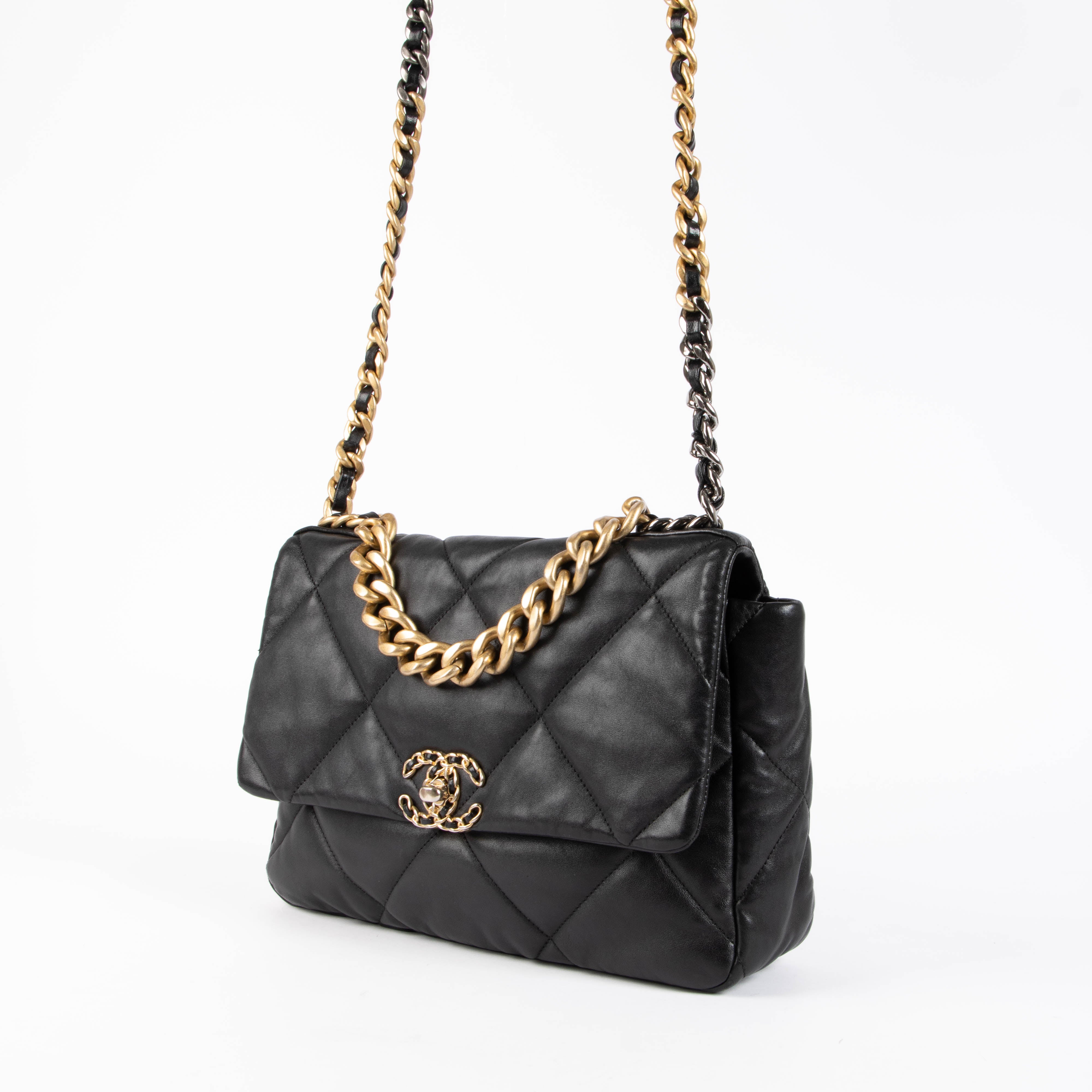 An iconic Chanel 19 Large Shoulder Bag crafted in black quilted leather, defined by its soft, oversized silhouette and contemporary appeal. The signature diamond quilting is complemented by mixed-tone hardware, featuring a distinctive chain composed of antique gold, antique silver, and dark ruthenium-toned metal.
