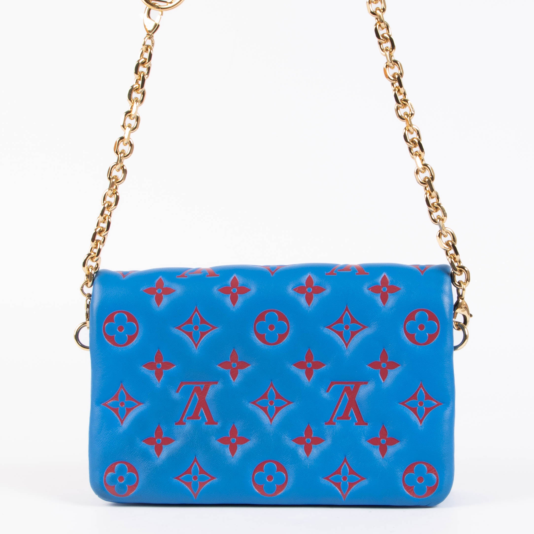 Louis Vuitton Blue x Red Pochette Coussin Bag is a bold and modern piece that reflects the brand’s contemporary aesthetic.