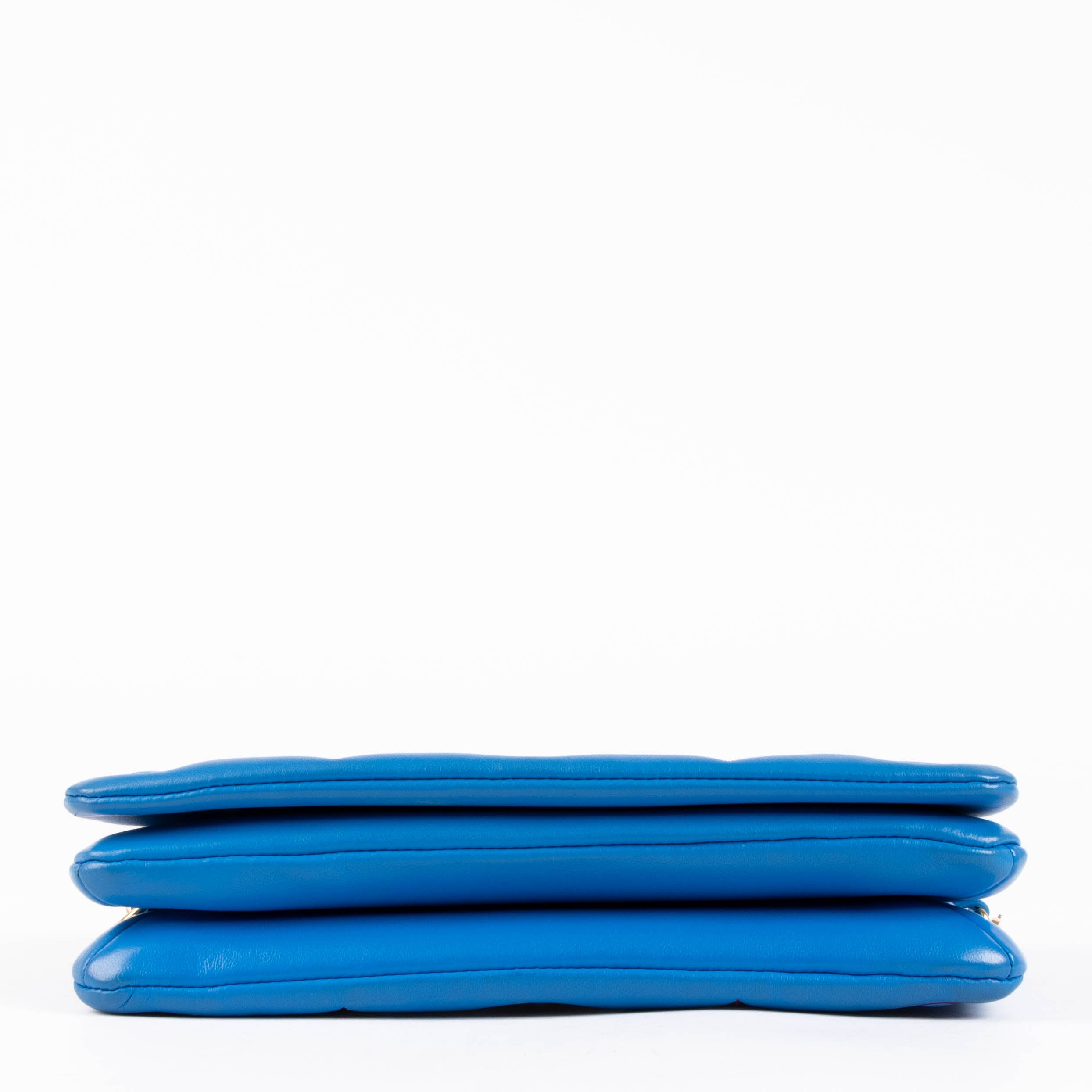 Crafted from soft leather in a striking combination of blue and red tones, this pochette features a padded, quilted design that gives it a unique and eye-catching look. The compact silhouette is perfect for carrying your essentials, while maintaining a playful yet refined style.