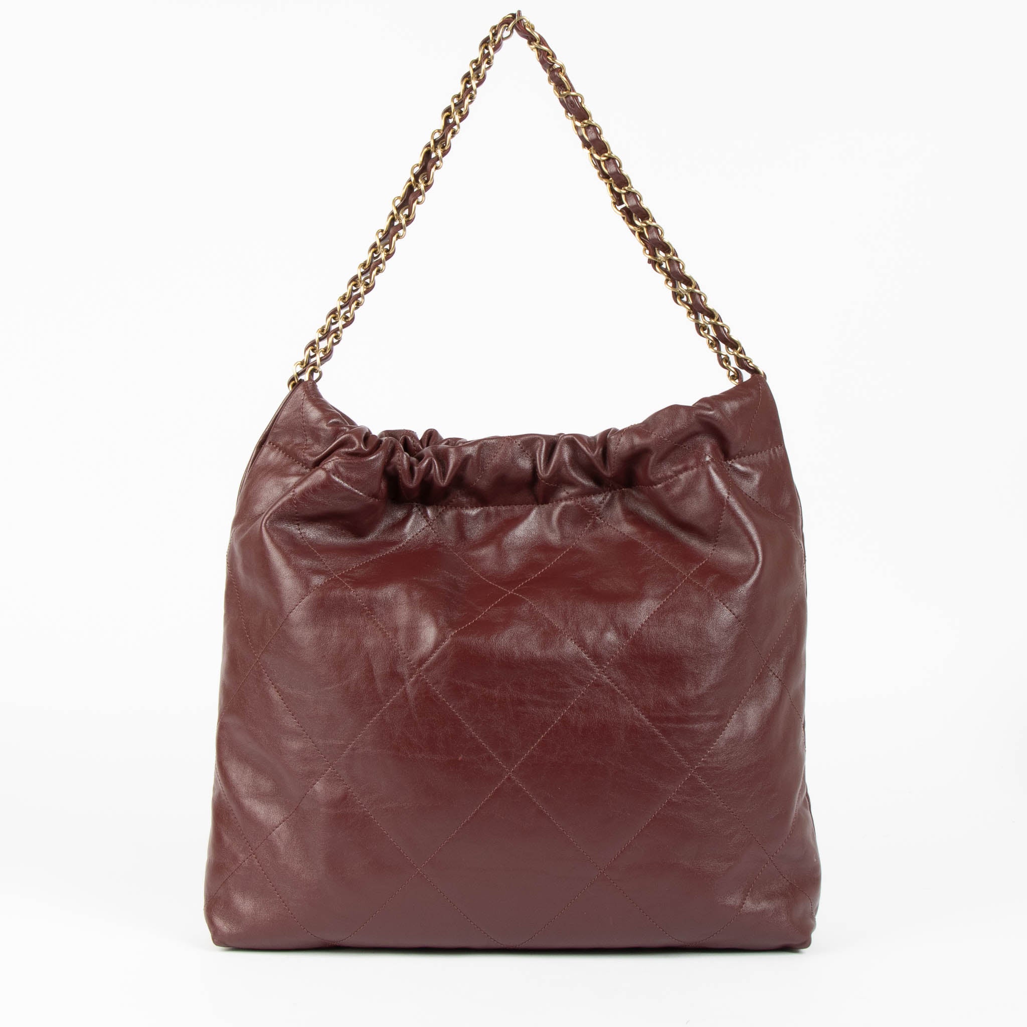 Chanel’s 22 shoulder bag is a modern and effortless piece that reflects the brand’s iconic style. Crafted from burgundy leather, it is complemented by gold-tone hardware for a refined finish. The relaxed, oversized silhouette features a two chain shoulder straps and a magnetic closure, offering both ease and elegance. Inside, the spacious interior provides ample room for daily essentials and includes a detachable pochette for securing smaller items, as well as an additional zip pocket along the side for added organization. A versatile bag that transitions seamlessly from day to evening, combining comfort with a sophisticated, contemporary look.