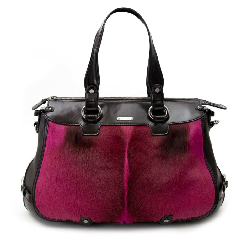 This Celine bag can be worn by the hand or over the shoulder with the top handles or removable shoulderstrap. The combination of brown leather and pink pony hair makes this bag one of a kind.