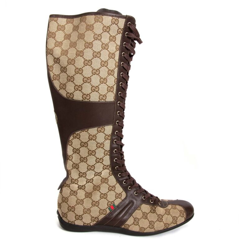 Dive into the monogram trend with these amazing ankle high monogrammed lace-up boots by Gucci.