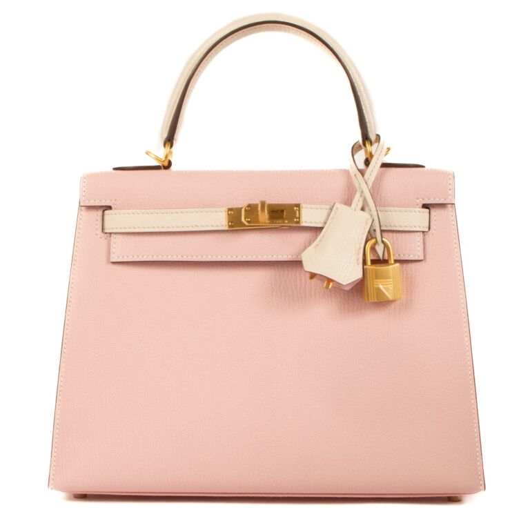 This dainty and rare Hermès Kelly 25 has the prestigious horseshoe stamp which means the bag is a special order. With the unique combination of two soft Hermès shades Rose Sakura and Nata in Chèvre Mysore goatskin, the bag has customized brushed-gold hardware and contrasting stitching. Endlessly elegant in your hand, this perfectly sized Hermès Kelly 25 is ideal for carrying from day to night.
