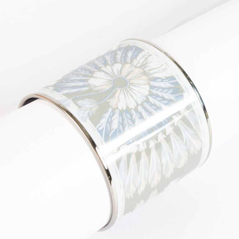 Made in France, this elegant Hermès bracelet is crafted from silver-plated metal and enamel, beautifully printed in soft shades of light grey, baby blue, baby pink, and white. Featuring a delicate feather ornament design, this timeless piece reflects Hermès’ signature craftsmanship and refined aesthetic. A versatile and sophisticated accessory, perfect for adding a touch of Parisian elegance to any look.