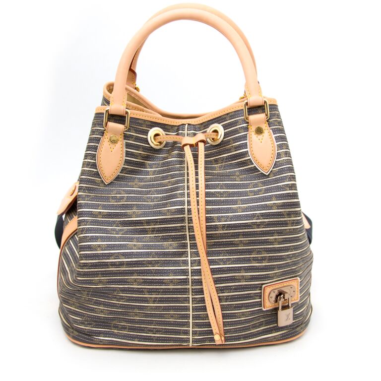 It's your chance to buy one of the most exclusive Louis Vuitton bags, this limited edition "Neo Eden Peach" bag is brand new and was part of the 2010 Printemps - Eté collection designed by Marc Jacobs. If you like to stand out and own unique items, this one is for you. Made out of the metallic LV monogram canvas stripes, cowhide leather trim and golden hardware. The sophisticated and practical bucket shape (you can wear the bag as shoulder bag or as crossbody bag) makes it the perfect bag. The interior is in stone grey microfiber and features a zipped pocket and 'Louis Vuitton Paris made in France' stamp.