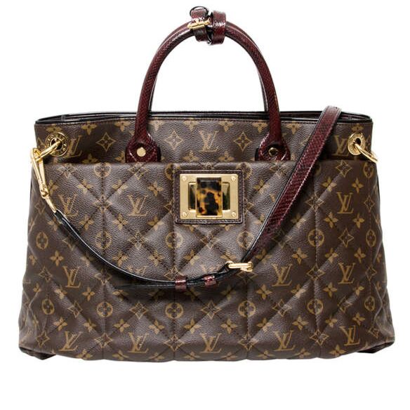 Louis Vuitton Monogram Etoile Exotique GM Tote Bag. "A rich blend of excuisite textures and details, the tote GM is truly luxurious. Soft quilted Monogram Exotique canvas and refined python, ostrich and patent leather combine to glamorous effect. Shiny golden brassed engraved harware; hand, shoulder or elbow carry with removable shoulder strap; front pocket with tortoiseshell acetate and gold brass twist lock closure; snap hook closure inside; interior zipped pockets and protective bottom studs." (as seen on Louis Vuitton). (Retail price : € 5050)